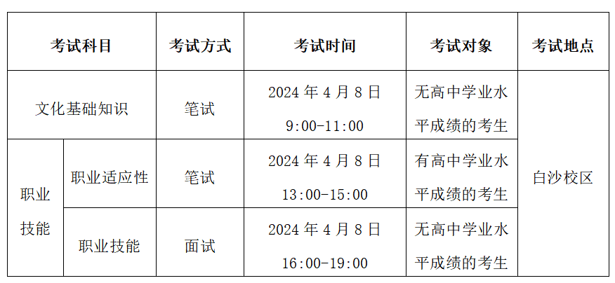 3.退役士兵考生,免文化课考试,按120分计算成绩;需参加学校组织的职业技能测试(面试)180分,满分300分。