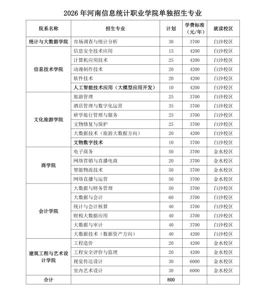 河南信息统计职业学院2026年单独考试招生计划